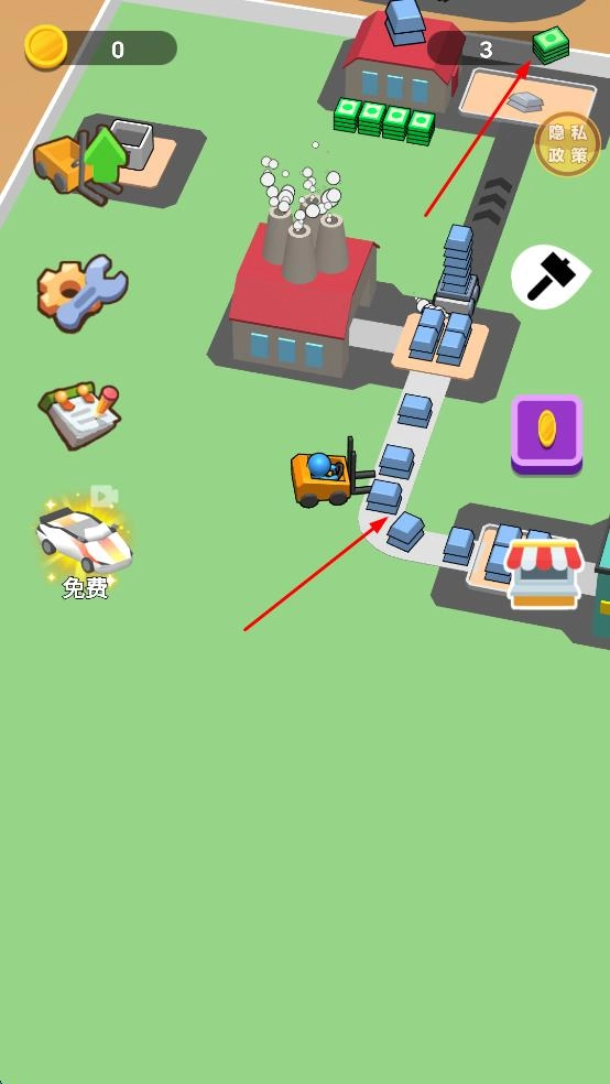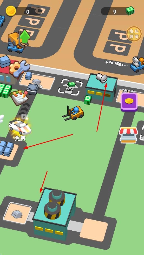 用获取的资源解锁新建筑,规划运输路线,让叉车高效运送货物到对应设施。