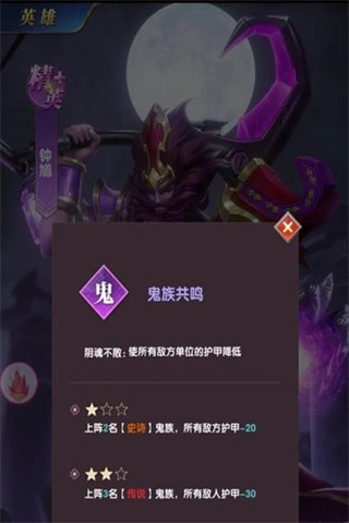 鬼族:要是说仙族的共鸣效果能让法师的共鸣体系更进一大步,那鬼族的效果就能让物理体系阵容的威力更进一大步。鬼族的共鸣效果会依据上阵英雄的数量和品级,降低敌方所有英雄20/30点护甲,这对敌方有着不小的限制作用。不管是在刺客体系里,还是在射手体系中,它都能为己方队伍带来很大的伤害提升。