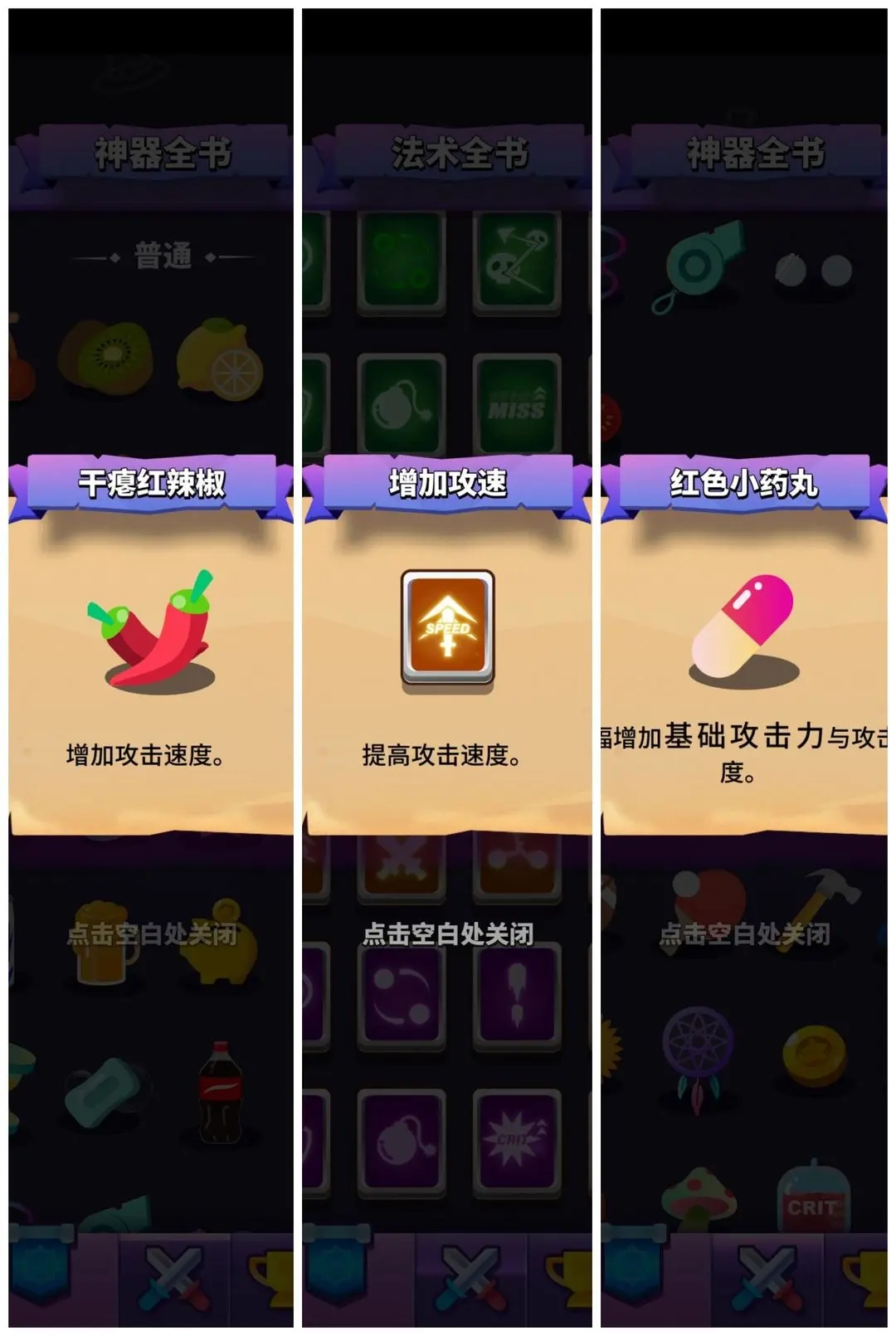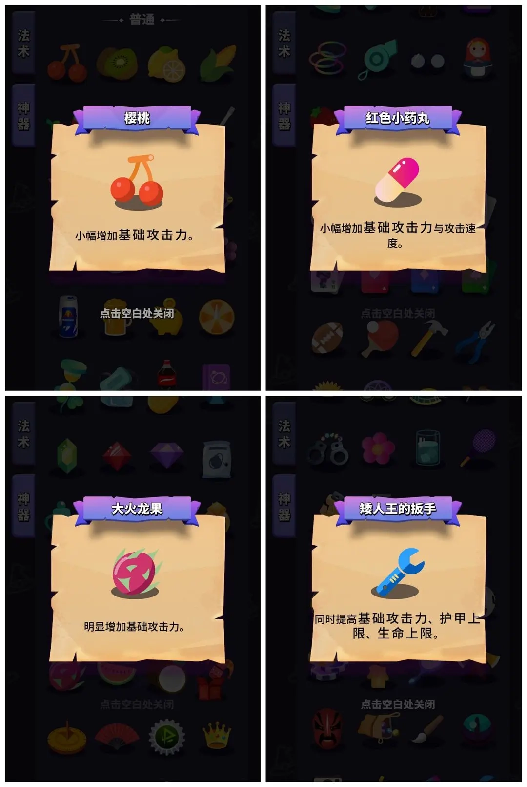 其实攻击速度这块没什么复杂的,就是把原本“哒哒 哒哒 哒哒”的攻击节奏,变成了“木大木大木大木大”的连续输出。打BOSS时能直接提升每秒伤害,而且每种加攻速的道具效果都很直观——小怪关卡里它还有个关键作用,就是能更频繁地击退近战小怪。接下来聊聊都有哪些攻速类道具: