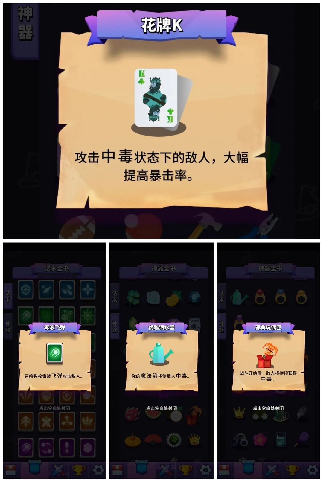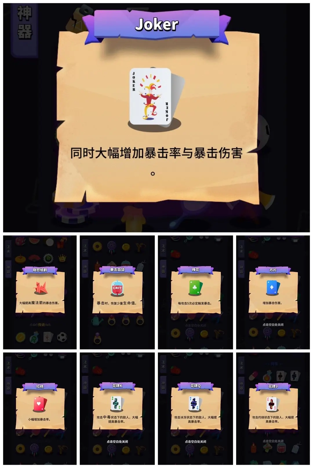 首先是暴击率法术卡,像红牌、蓝牌、千纸鹤这类,都是能实实在在提升我们暴击和爆伤的,属于碰到就该拿的类型。joker也是平A流里绝对的核心,是必不可少的存在。不过这时候我们离满暴击可能还差点意思,这就需要花牌来帮忙了。在三种花牌里,我更推荐毒花牌作为提升暴击率的选择——因为冰冻状态不仅难触发,持续时间还短,烧伤也是同样的问题,所以冰花和火花牌可以先排除。至于能上毒的道具,我推荐下面这几个: