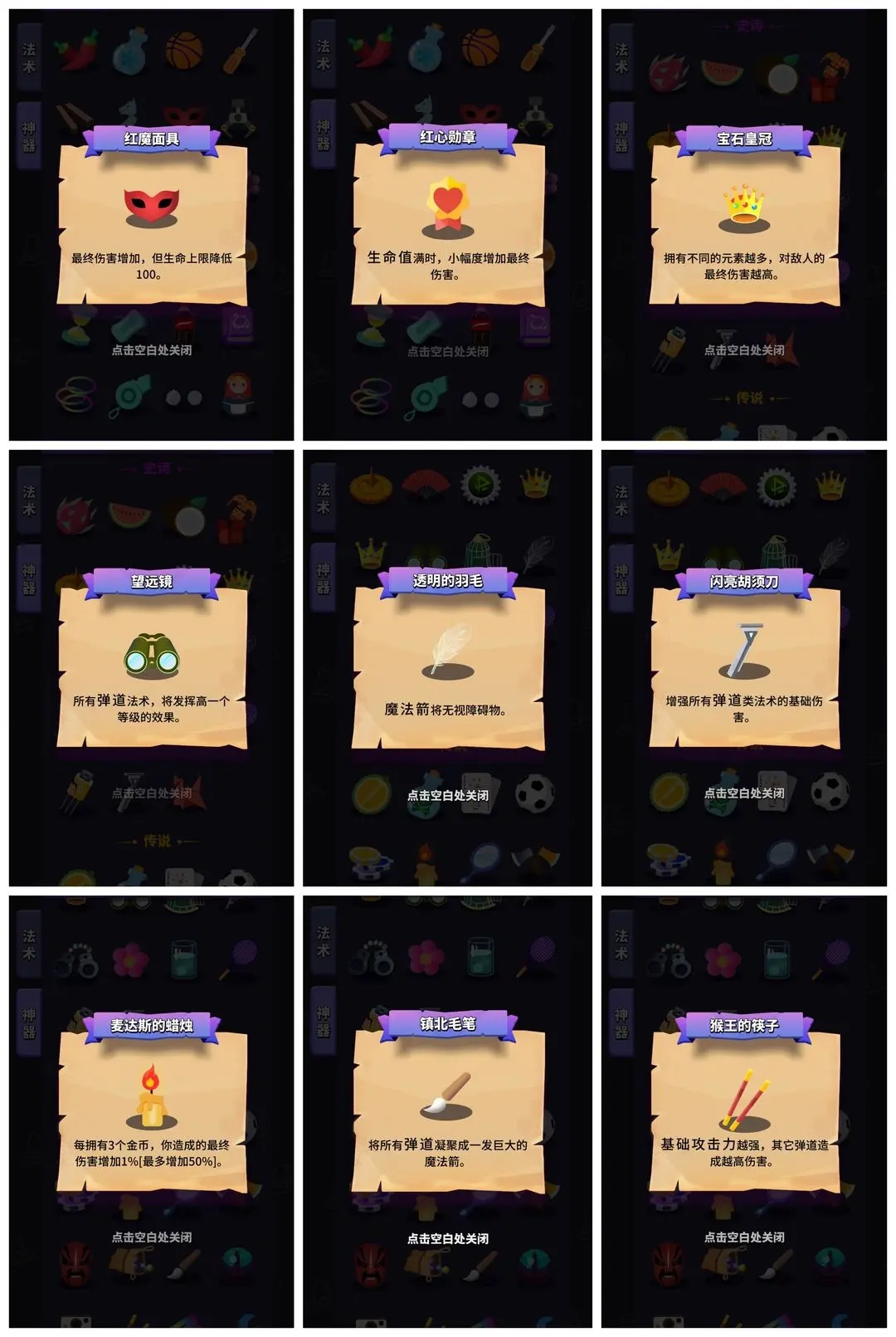 另外,我发现有些玩平A流的小伙伴在选金色神器时还会拿脸谱和斧头。但我觉得其实没必要:脸谱乍看之下好像挺厉害,不过我们有了望远镜之后,脸谱的作用就显得多余了;至于斧头,是因为平A流对紫色神器的需求本来就不高,很容易就能凑齐,到后期可选的大多是环绕物之类的神器,所以即使在精英关拿两个斧头,对平A流来说也算不上特别强力的增强。披风搭配魔法书的组合我就不再多做赘述了,各类神级道具大家也都有所了解,接下来直接聊聊各流派通关后的一些心得,感兴趣的话可以尝试一下。