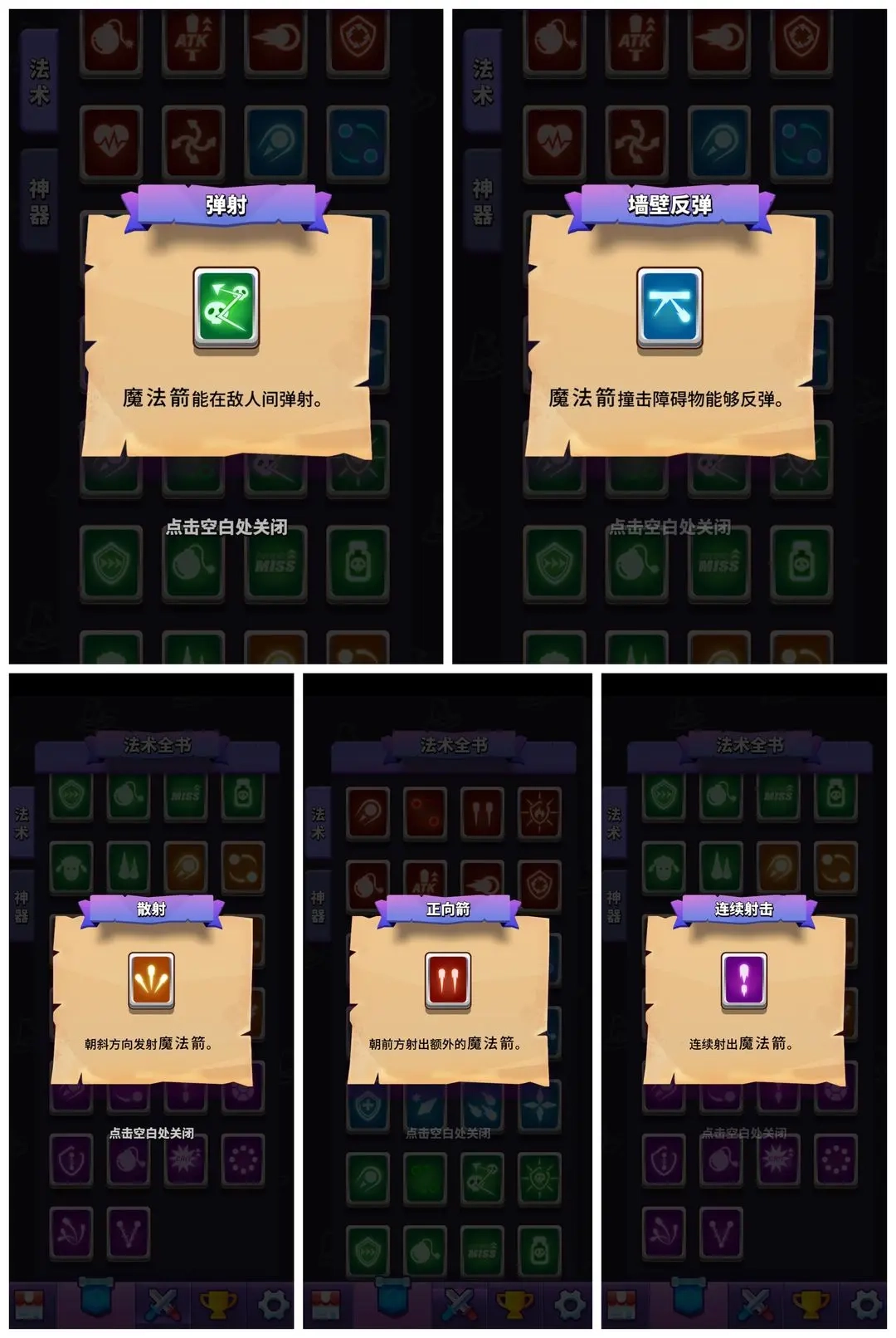 我们先看前两个技能。第一个是墙壁反弹,效果就是碰到障碍物时弹射一次,属于比较朴实的技能,优先级不算高,拿不拿都行。第二个弹射就很有意思了:1级弹射状态下,平A攻击a怪后,会自动弹向离a怪最近的b怪;如果是2级弹射,还会再弹一次到c怪。需要注意的是,弹射的伤害是固定18点,不会受自身攻击力加成影响。单论伤害的话,弹射不算高伤害技能,但它有个实用之处——某些关卡进门就有几个突脸怪在身边,弹射能稳定击退它们,算是个小自保手段。另外要是拿了镇北毛笔,弹射就不会触发,可以直接把这个技能弃掉。