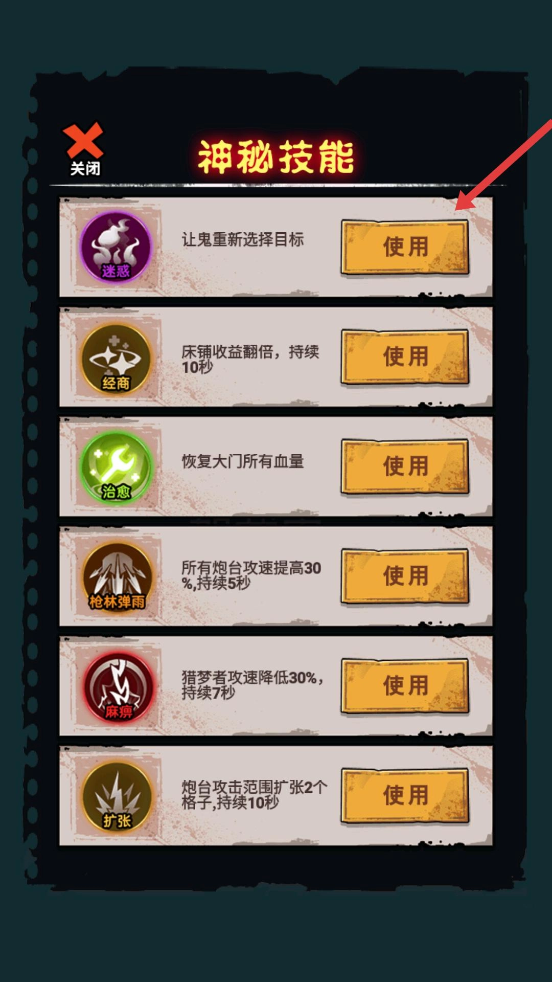 在游戏进行过程中,若遇到突发状况,你可以打开神秘技能界面,根据当下的局势,点击合适技能旁边的使用按钮,借助技能效果来助力战斗。