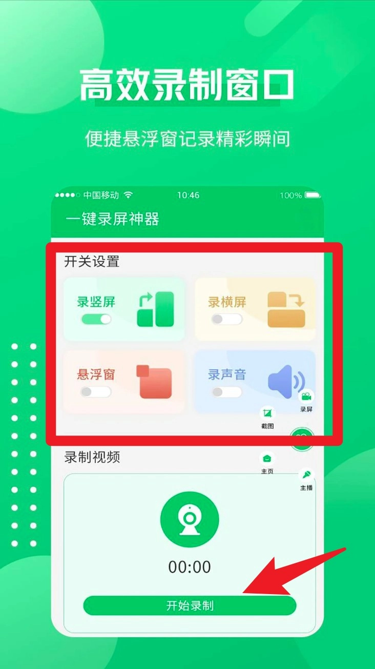 打开「一键录屏神器」,在主界面上能选择录竖屏、录横屏、录声音等开关,灵活搭配录制参数后,点击下方的“开始录制”按钮即可。