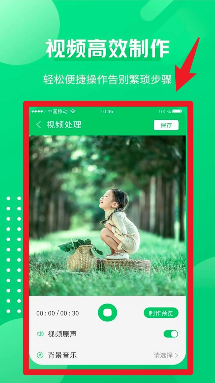 录制结束后进入「视频处理」页面,可进行视频预览,还能选择开启原声或是添加背景音乐,简单一步就能完成基础剪辑操作。