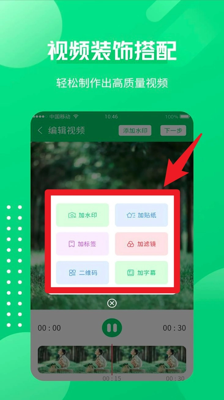 在“编辑视频”页面,你可以添加水印、贴纸、标签、滤镜、二维码、字幕等装饰元素,以此来对视频风格进行自定义设置。