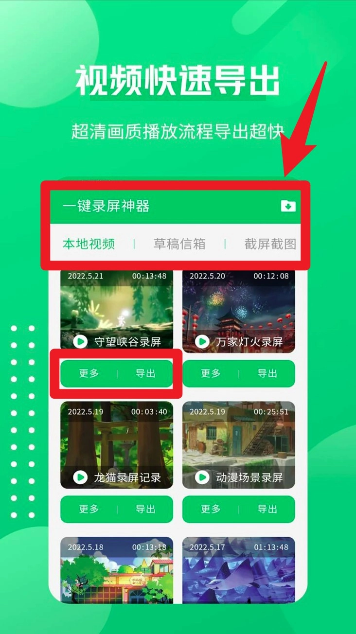 回到主页面的「本地视频」分区,就能查看所有录屏历史,点击“导出”按钮,就能保存高清视频或者分享到其他平台。