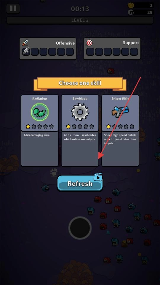 LEVEL1结束后,你会进入技能选择界面,需要从Radiation、Sawblade、SniperRifle这三个技能里挑选一个,点击对应的卡片,就能为接下来的关卡战斗提供助力。