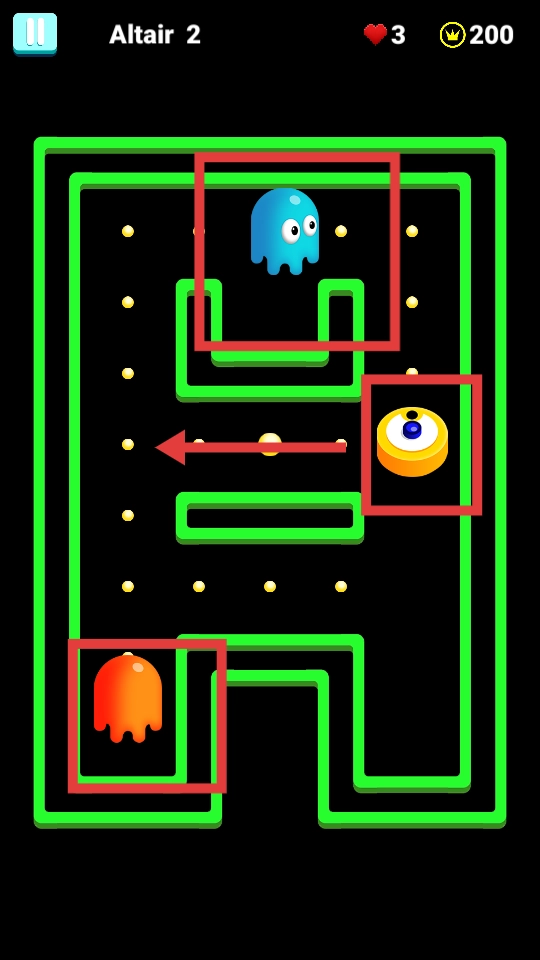 你需要操控角色在迷宫中移动,沿着绿色通道去收集黄色的光点,同时要躲避各种不同颜色的怪物,只要抵达目标位置就能顺利通关。
