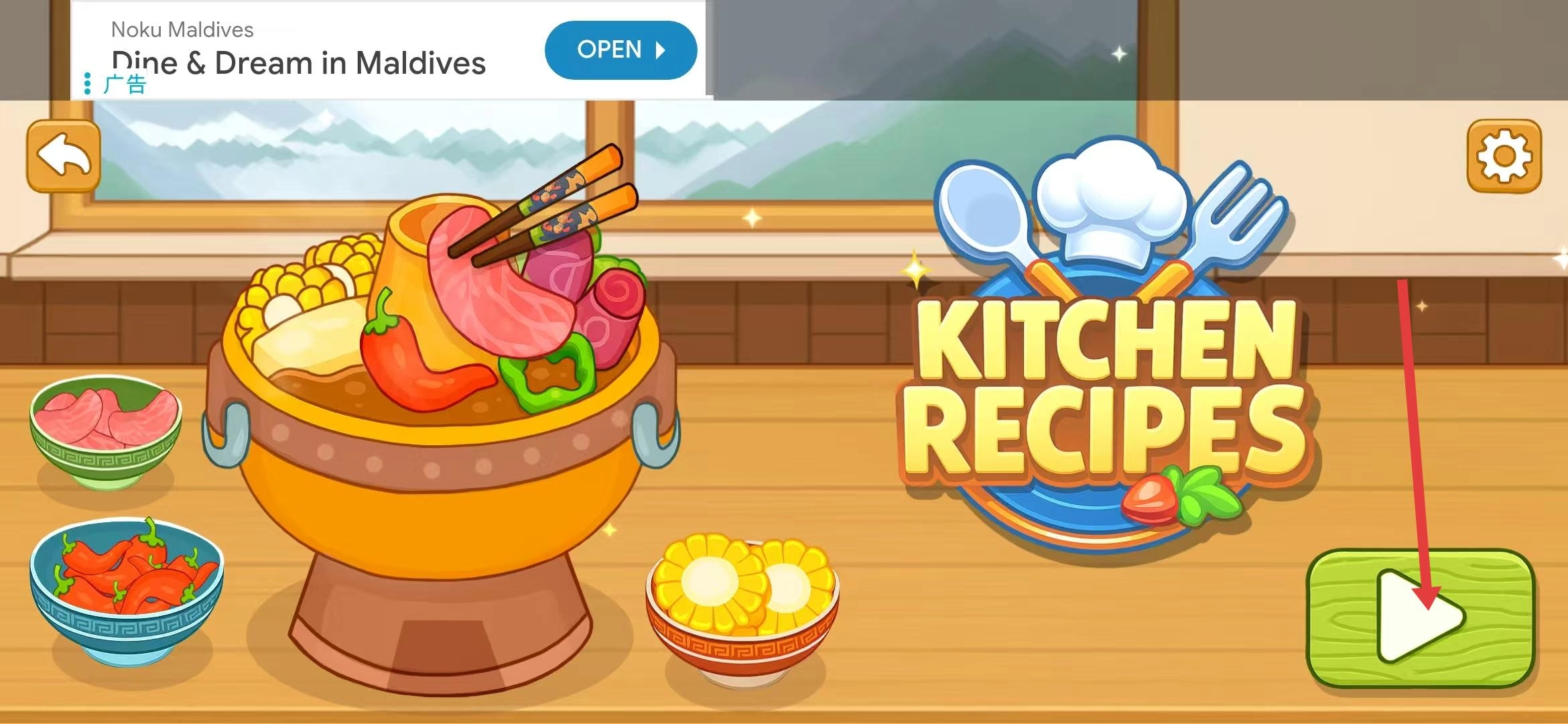 玩家进入游戏后,映入眼帘的便是主界面。在界面的右上角,有一个齿轮形状的图标,这就是设置按钮,通过它可以对游戏的各项参数进行调整。而点击界面右侧那个带有三角形标识的绿色按钮,就能开启一段充满乐趣的烹饪之旅了。