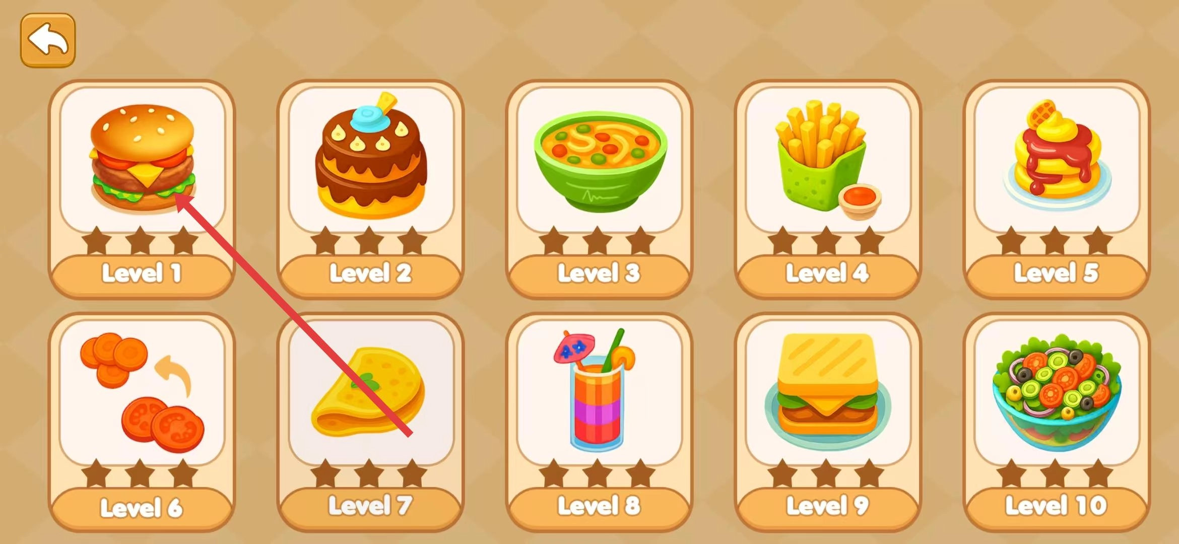 点击开始按钮后,你会进入关卡选择界面,这里呈现了从Level1到Level10的各类美食关卡,每个关卡都对应着不同的菜品,一开始只有Level1的汉堡关卡能够进入。