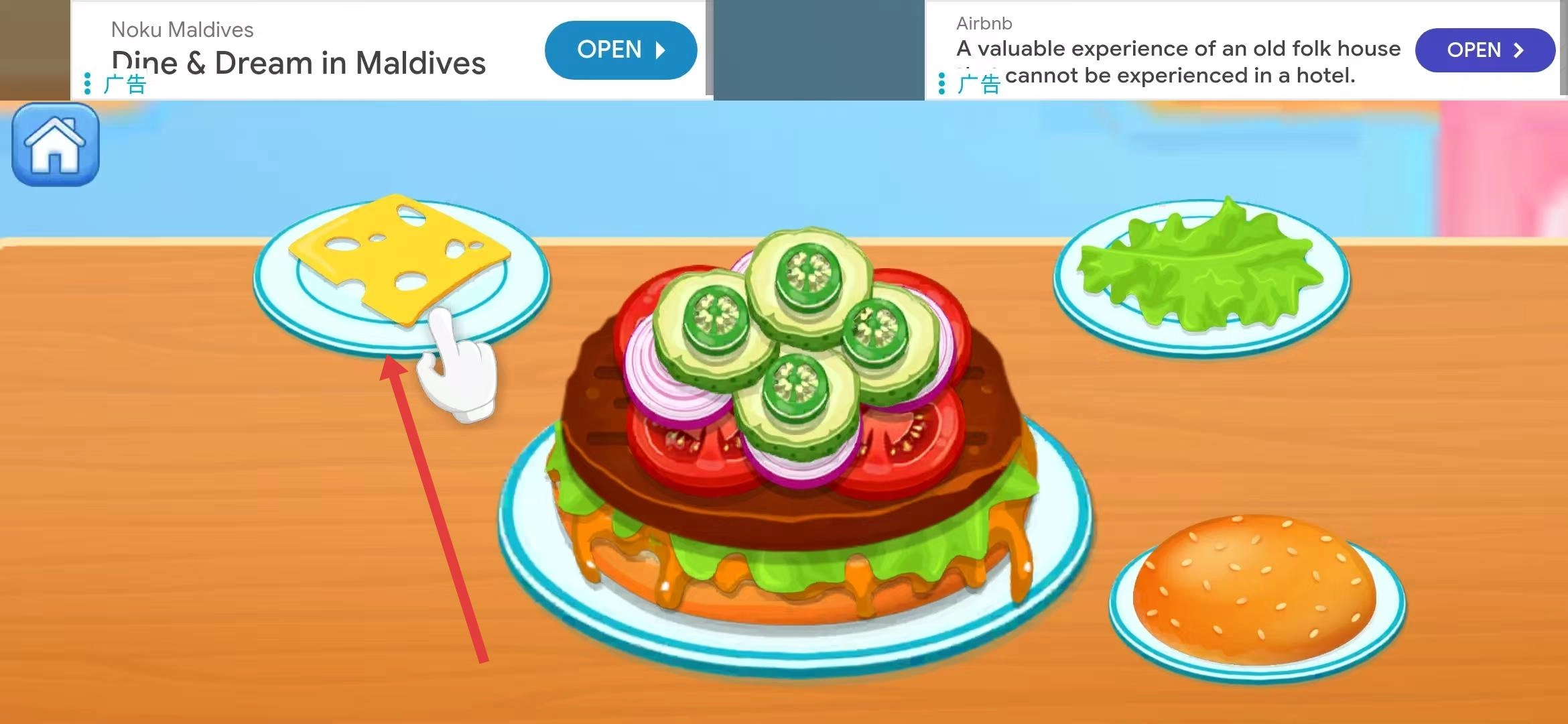 进入具体关卡后,例如汉堡关卡,游戏画面会展示制作汉堡所需的各类食材,玩家需根据游戏提示,按顺序点击所需食材并添加到汉堡上,完成食材的搭配步骤,直至整个汉堡的制作流程全部结束。