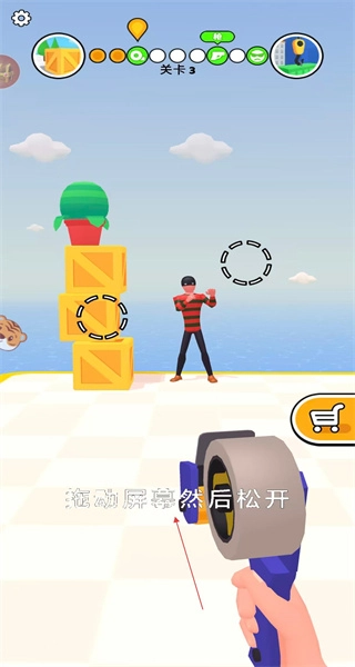 进入游戏的第三关,顶部会显示与该关卡对应的标识,底部则提示玩家拖动屏幕后松开,以此来准备利用胶带工具推动关卡的进行。