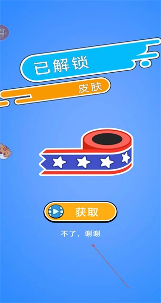完成关卡操作后会跳转至皮肤解锁页面,页面上会展示已解锁的皮肤样式,底部设有“获取”和“不了谢谢”两个选项,用户可选择对应选项来结束当前流程。