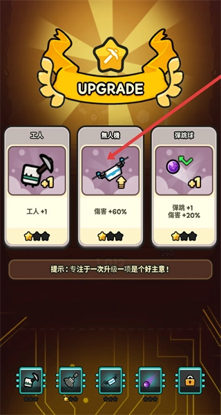 在升级界面时,建议优先选择无人机相关的选项来提升伤害输出,点击对应的卡片即可确认升级,从而增强机甲的战斗能力。后续可以补充升级工人和弹跳球,以实现战力的均衡发展。