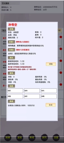 首先安装本游戏,进入游戏后点击养成界面,玩家可以查看当前自身的仙人信息、已拥有的仙人、持有的仙石、总战斗值以及钻石等内容。