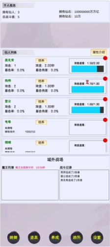 玩家还能看到仙人列表,像黑无常、雨师、雷公、电母这类仙人都在其中,可供培养的仙人数量十分丰富。每个仙人都具备独特的属性,涵盖攻击、攻速、暴击率、暴击伤害等方面。