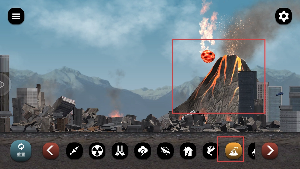 点击下方的火山图标,就能触发火山喷发,释放出熔岩球,以此摧毁城市里的建筑,完成破坏目标。