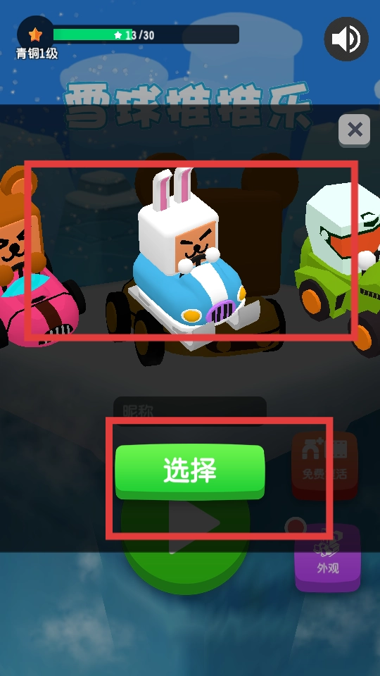 在选角界面,先点击佩戴兔子头饰的角色以及蓝色赛车,接着点击选择按钮,确认参与比赛后,即可进入雪球堆堆乐的游戏玩法。