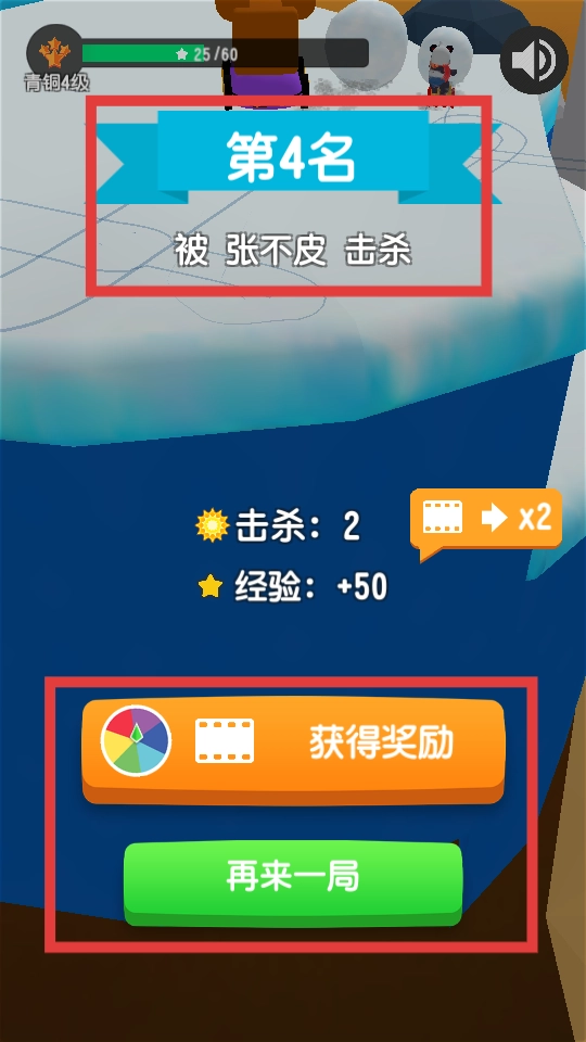 结算界面会呈现排名第四以及被击败的信息,点击“领取奖励”按钮可获取结算道具,点击“再来一局”按钮则能重新开始游戏。