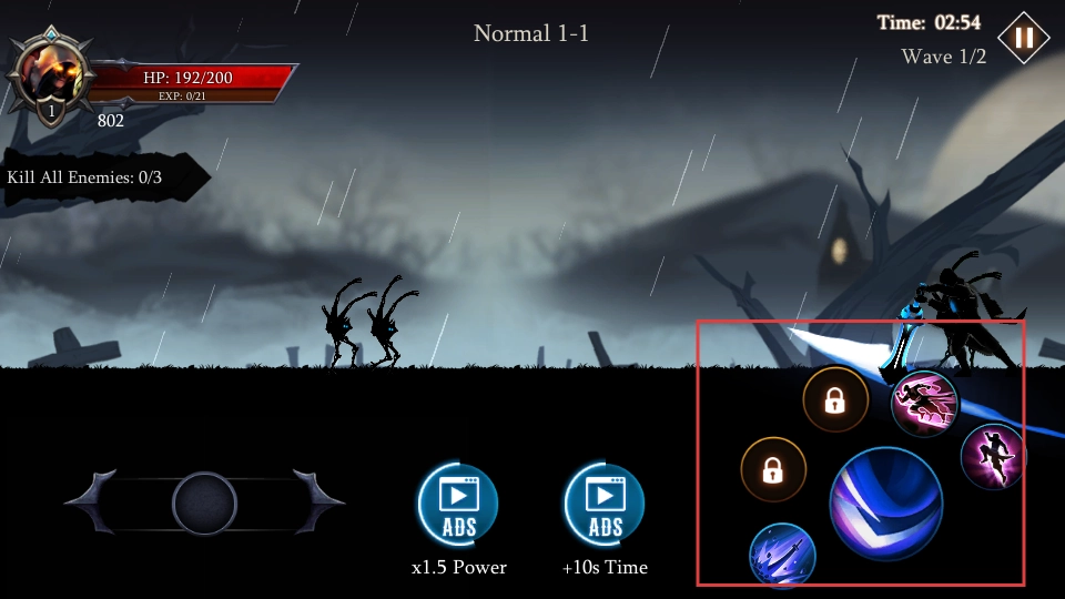 当遭遇敌人时,点击界面右侧的技能按钮,释放技能对敌人发起攻击,一步步将关卡里的所有敌人都消灭掉。