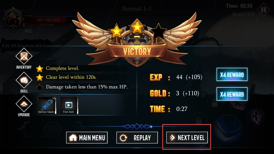 当所有敌人都被成功击败后,界面会出现VICTORY的提示,此时点击NEXT LEVEL按钮,就能进入下一个关卡,继续这段冒险之旅。