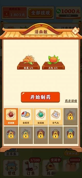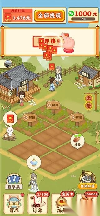 2、进入游戏后点击【开始赚钱】,接着点击空地种植草药。在订单列种植完成后点击“加速”,就能让草药生长得更快,从而快速成熟。