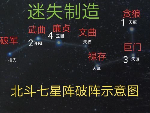 天枢宫贪狼星君、天璇宫巨门星君、天玑宫禄存星君、天权宫文曲星君、玉衡宫廉贞星君、开阳宫武曲星君、摇光宫破军星君。破阵时需留意各星宫的名称,从中找出提示语所指向的四位星君,便能成功破阵,具体可参照图示: