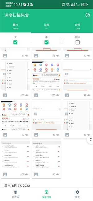 在开启深度扫描界面后,系统将自动对之前删除的图片、视频与音频进行扫描。