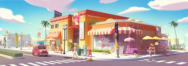 风格:典型西方快餐店门面,橙红黄暖色设计,整体Q萌风格。