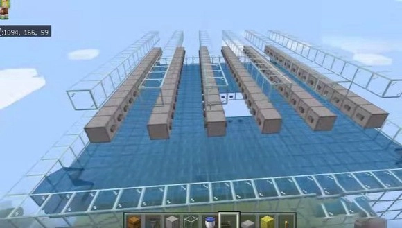 3、在距离下面流水的平台3格的距离位置搭建17×1的平台,一共建造6个这样的平台,每个平台之间距离是两格,距离边缘是3格,离平台一格的位置放相同规格的玻璃,平台侧边放上按钮,玻璃的作用是把刷新在平台的怪物挤下去,这是刷怪的平台。