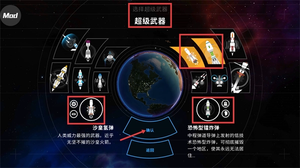 2、在【选择超级武器】界面,可选用【沙皇氢弹】等武器,确认选择后点击【确认】即可部署该超级武器。