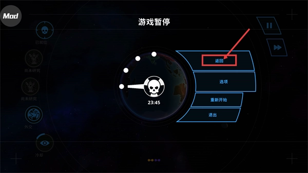 4、在【游戏暂停】界面,可通过【返回】回到对局,也可选择【重新开始】等选项调整游戏状态。