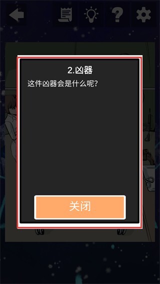 1、当碰到与【2-凶器】相关的问题时,点击【关闭】按钮退出当前对话,这样就能继续寻找线索来推进调查。