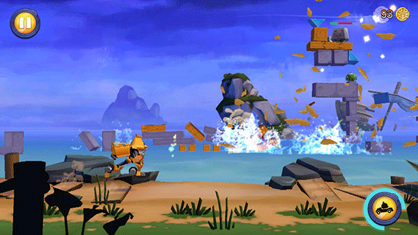 坍塌的高塔是我们常会碰到的阻碍,当变形金刚跑到此处时,高塔便会倾倒,以其常规的跑酷速度根本无法避开。这时只需点击屏幕右下角的汽车图标,汽车人就能化作疾驰的车辆,迅速躲过高塔。