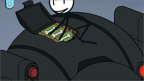 5、要是玩家没能完成五角星的绘制,就会被关进监狱。火柴人在监狱里成功越狱后进入了机器人设备室,此时玩家可以选择将机器人打包带走,也可以选择召唤怼人鸭。