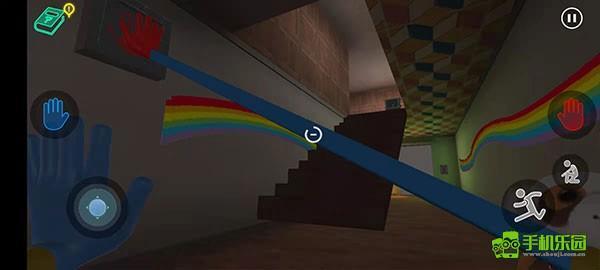 7、手套收集完成后会自动回到手中,此时能看到墙的两侧有红色和蓝色的手印,玩家只需将手套对准对应的区域,就能打开房门。