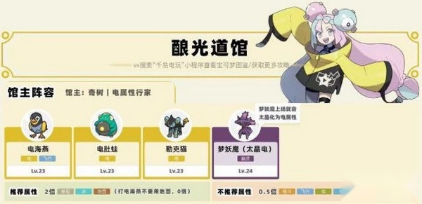 酿光市的电系道馆馆主是奇树,他拥有四只宝可梦,其中主力是24级的梦妖魔,这只宝可梦在太晶化变为电属性后会变得比较棘手!建议先捕捉一只地面系的乌波,等它进化后就能轻松克制奇树的队伍了。
