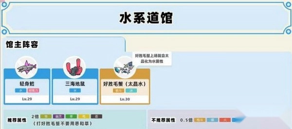 玻瓶镇的水系道馆馆主是海岱,他有三只宝可梦(重复2次),其中等级最高的是30级的好胜毛蟹,千万别用草属性的宝可梦去挑战它!因为好胜毛蟹并不是水系宝可梦哦!不过后续它还是会进行太晶化变成水系……这时候换一只电系宝可梦,比如咩利羊来对付它就可以了。