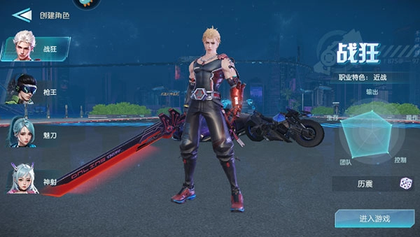 1、进入游戏后,选择创建角色,可在战狂、枪王、魅刀、神射这四个职业中进行挑选。