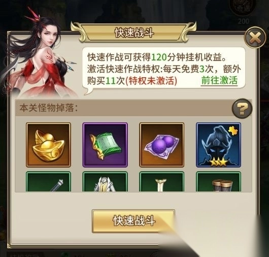通过第二关后解锁快速作战功能,使用该功能可立即获取等同于120分钟挂机的丰厚经验奖励;若希望进一步提高效率,可前往特权商城激活专属特权,以此获得额外的购买次数。