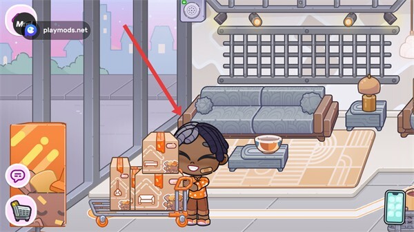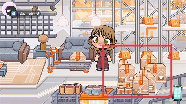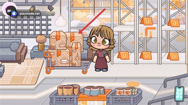 2、操控角色推动搬运车,移动到堆放货物的区域,靠近要搬运的箱子。