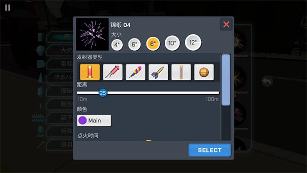8、我们选择其中一个并点击,随即会弹出这样一个界面,在这个界面里能够选择烟花的大小、发射器的类型、烟花发射的距离、烟花引线燃烧的时长等参数。