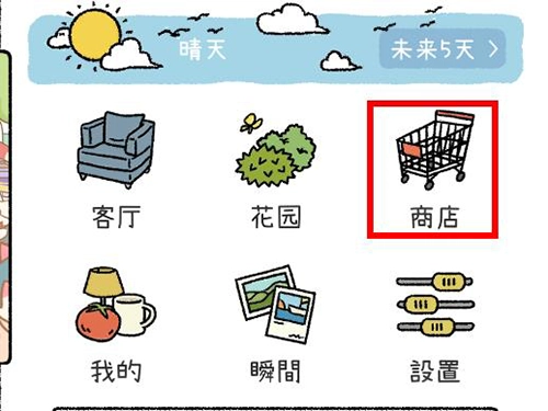1、启动萌宅物语应用,接着找到并点击“菜单”按钮,在弹出的小窗口里选择“商铺”选项。