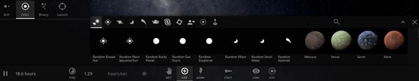 添加物体时,点击“add”按钮,会弹出如下界面:在此界面中,可添加行星、恒星、卫星、星系、黑洞、日常物体、航天器等各类物体。你只需点击目标物体,再将其放置到空间内即可,从理论上讲,该空间能够容纳的物体数量没有上限。