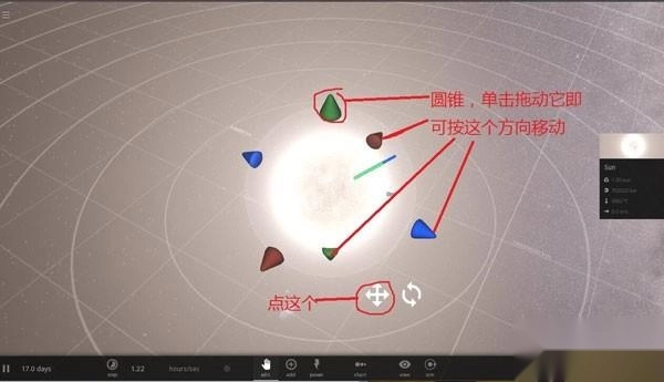 若想调整已添加物体的位置与间距,可点击“add”按钮左侧的“edit”按钮进入编辑模式。选中需移动的物体后,按住鼠标左键拖动即可在平面内调整其位置;若要修改星体的自转轴方向,只需单击并拖动物体对应的自转轴部分即可完成调节。