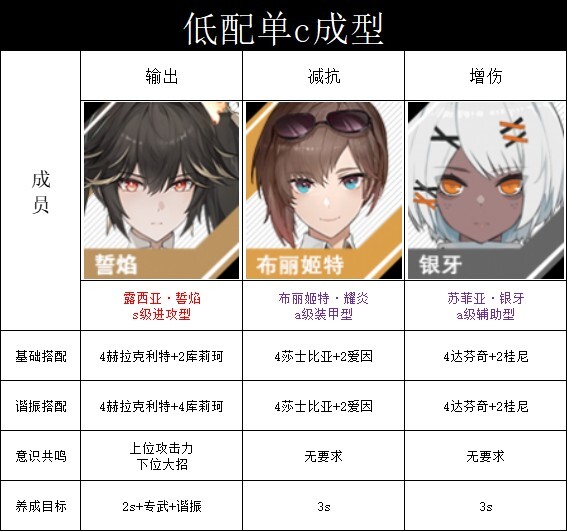 誓焰搭配库莉珂可借助其提供的额外能量保障续航,低配辅助可选用A级火属性装甲型与辅助型角色,能实现快速搭配成型。
