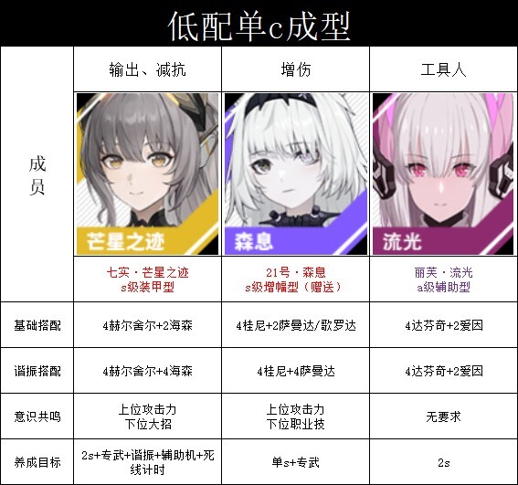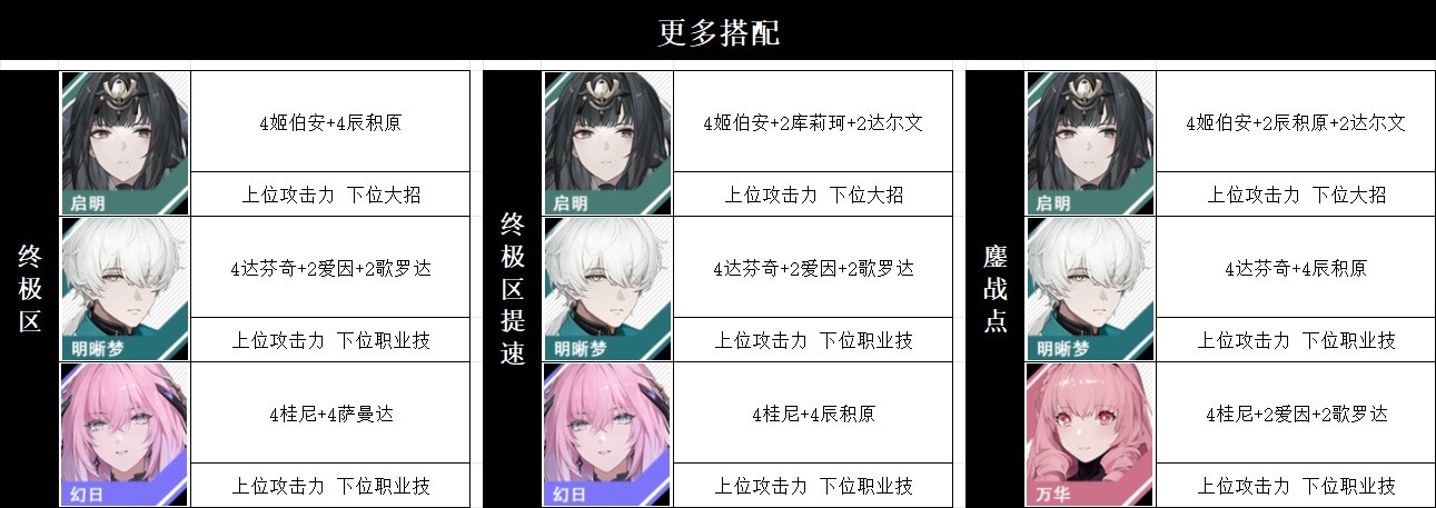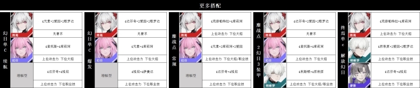 本文主要面向新手玩家,帮助大家理解阵容组合与意识搭配的底层逻辑。每个队伍都会提供三种搭配方案:①低配单C的成型组合、②轮切体系的毕业配置,以及③更多拓展搭配。需要说明的是,部分极端场景下的意识搭配并未纳入其中。如果是轻度玩家,只需重点关注“成型”和“毕业”这两个板块;而“更多搭配”里收录了一些竞速向或特殊用途的组合,感兴趣的玩家可以进一步了解。