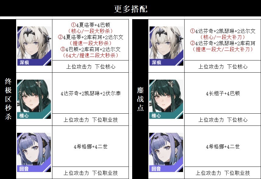 进行长线作战时,檀心搭配库莉珂以确保续航能力,回音则携带4个希格娜来获取高额的暴击率加成。
