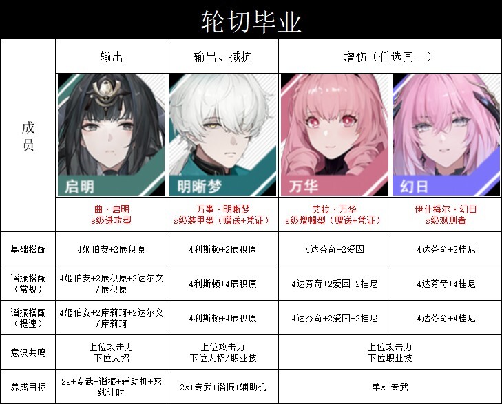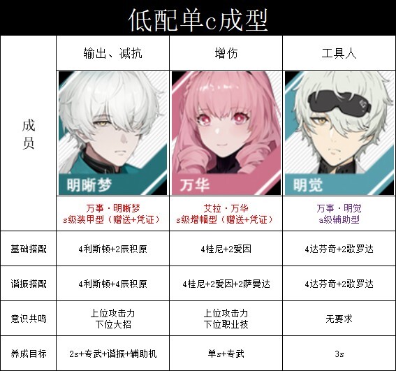 明晰梦的循环体系不缺能量,不需要携带库莉珂,直接带4辰积原就能获得大量加成,还能空出辅助位的意识格子。而且明晰梦自身作为装甲型角色可以减抗,搭配万华或明觉就能凑齐冰队体系内的buff,第三个位置任选成员作为意识和武器共鸣的发射器即可。